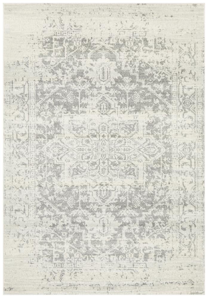 Bring out the beauty and elegance with a touch of global inspiration with this head turning, eye catching pile. The Evoke Dream White Silver Rug made from quality polypropylene materials is machine woven in Turkey. It showcases a floral center emblem laid in a gray hue context, with duly imposed serge edges of interloping white yarns adding more value and durability to the product. Definitely high chic and can withstand well-traveled areas.